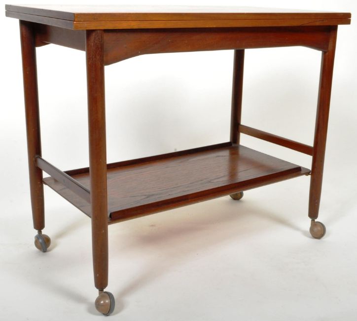 A retro vintage mid 20th Century 1960's solid teak two tier tea / cocktail drinks trolley / games table having a fold over top with second tier below. All raised and supported on tapering legs upon ball castors. Measures approx; 65cm x 77cm x 41cm.