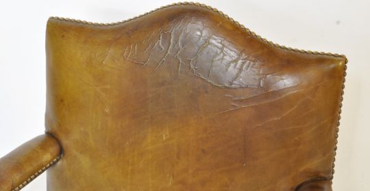 A 20th century mahogany gainsborough desk chair upholstered in green leather with a studded border. The library armchair has scrolled elbow rests with floral carving raised on upright supports. Measures approx. 93cm x 64cm x 48cm.