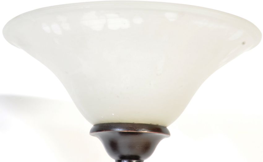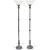 A pair of contemporary metal upright floor standing light / lamps. The lamps having white glass shades with metal turned columns raised on a circular plinth base. Measures approx. 183cm tall.