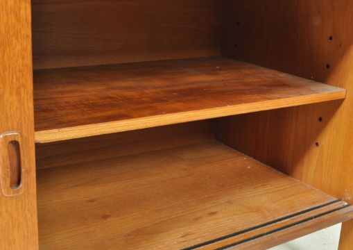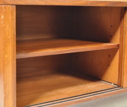 A retro vintage mid 20th century circa 1960s sideboard credenza having two sliding doors opening to reveal a shelved interior raised on upright supports. Measures 67 x 145 x 51cm.
