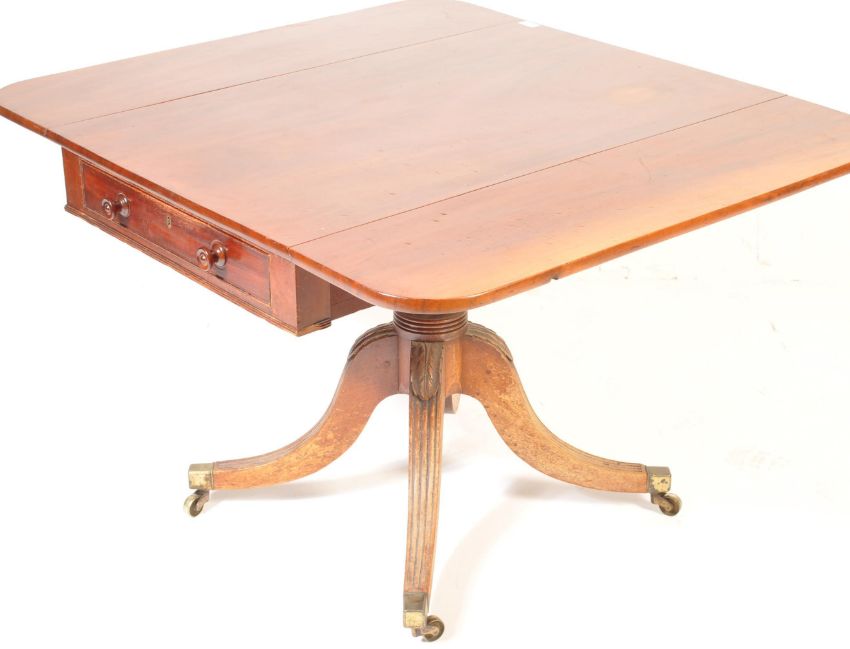 A 19th Century Regency mahogany sofa table having two drop leaves over a single drawer to the frieze with turned handles handles raised on a turned column with a quadruped splayed base set on brass feet and castors. Measures approx. 72cm x 99cm x 62cm.
