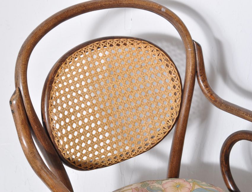 A pair of late 19th century Victorian Thonet manner cafe bentwood chairs / armchairs. Each having scrolled arms with shaped caned back rests and seats. Measures, 90 cm H x 52 cm W x 46 cm D