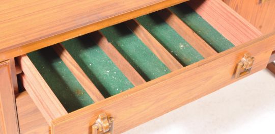 A vintage retro mid 20th century teak wood sideboard credenza. The sideboard having a bank of three drawers to the centre, single door cupboard to the left and twin doors cupboard to the right raised on shaped supports. Measures 73 x 184 x 47cm.