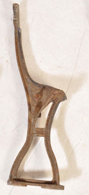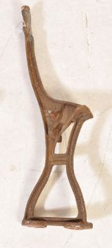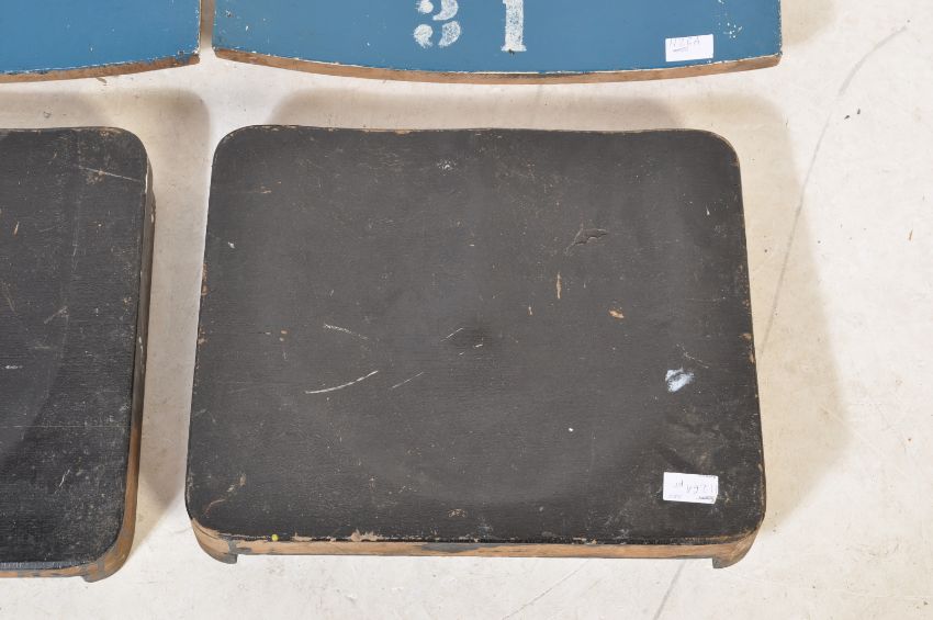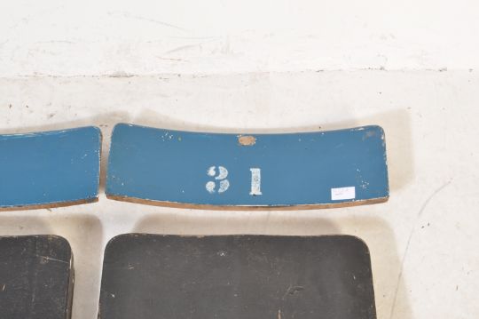 Of Local Bristol Interest - A pair of early 20th century seats from Eastville Stadium, constructed in 1897 and demolished in 1998 and home of Bristol Rovers F.C. The saddle seats being painted back and blue with seat numbers 31 & 30 stencilled in white with cast iron bench ends. Measures 41cm x 35cm x 4cm.  Measures 76cm x 20cm x 4cm.