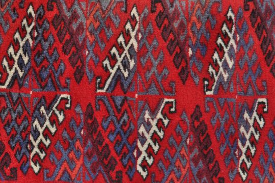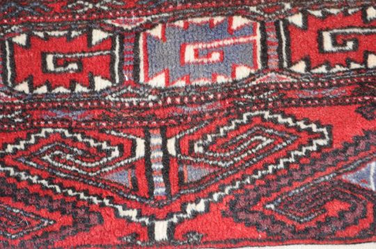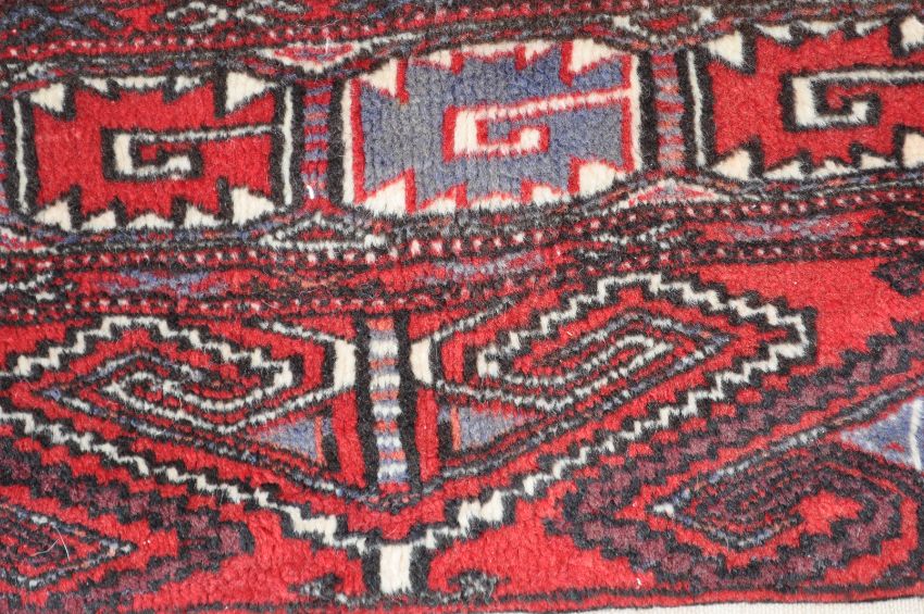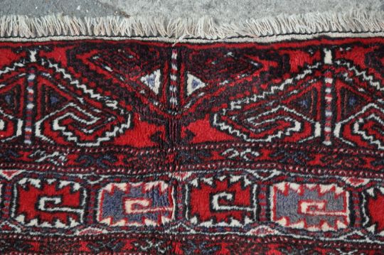 An early 20th century Turkoman carpet / rug. The Persian Islamic rug of large proportion having red field decorated with blue white and dark red geometrical motifs, dark red inner and outer border and cream main border decorated with purple and red geometrical motifs. White fringes to each end. Measures: 307cm x 210cm.