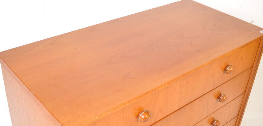 Meredew - British Modern Design - A retro vintage mid 20th century circa 1970s teak chest of graduating drawers having a bank of 5 drawers with round handles with metal frames. Measures 96 x 90 x 43cm.