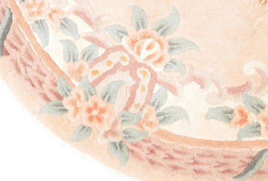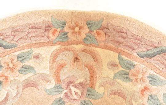 A vintage 20th century Chinese Oriental rug of oval form having a white background with polychrome floral decoration.