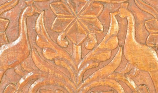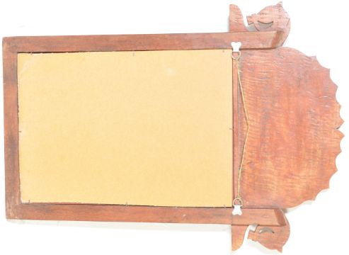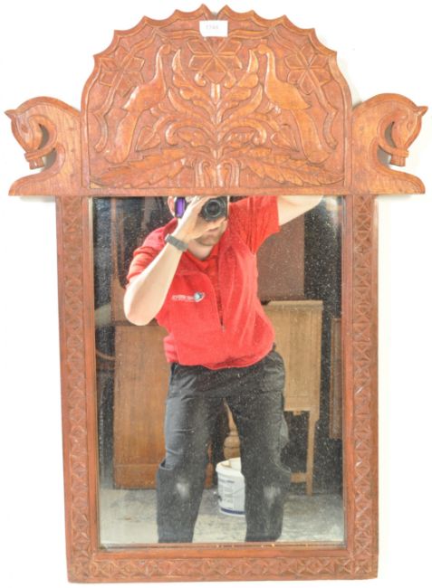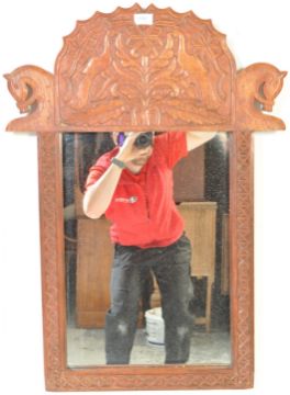 A vintage 20th century exotic hardwood carved mirror having foliate and avian decoration with geometric patterns to the side. Measures approx. 81cm x 58cm