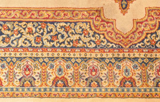A 20th century Persian Islamic carpet rug having a large foliate decorated medallion to the centre set on cream background with floral stylised borders. Measures approx. 299cm x 203cm