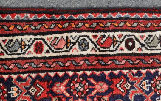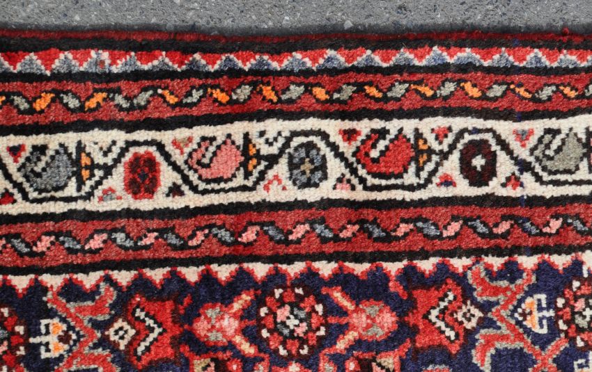 A mid 20th century hand woven Persian Islamic Malayer runner / carpet rug. The rug having a dark blue field decorated with red floral and geometrical motifs, red corners with floral motifs, cream main border and red inner and outer border. Short white fringes to each end. Measures: 321cm x 91cm.