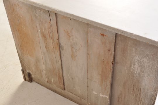 A Victorian 19th century painted pine chest of drawers. Raised on ogee bracket feet with shaped apron. Above, a 2 short over 2 deep drawer configuration  having embellished scroll worked detailing. Finished with knob handles