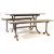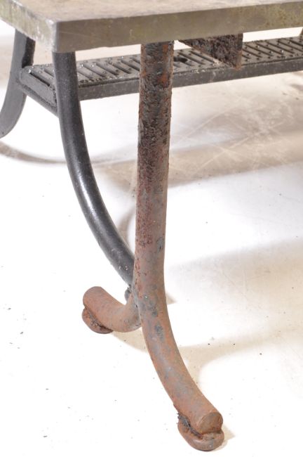A contemporary slate topped picnic table of rectangular form having an ebonised metal frame. Comes with two lower slate topped benches.