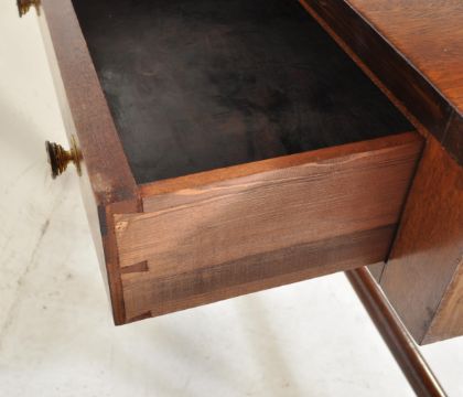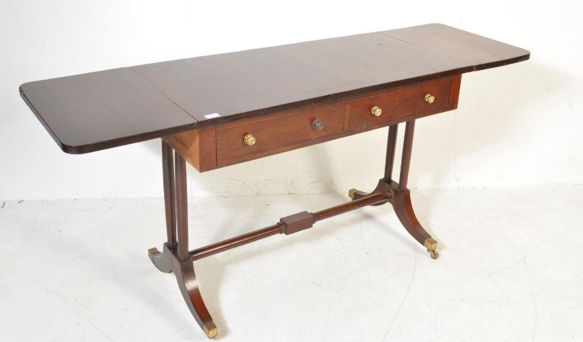 A Regency revival good quality reproduction George III period sofa table / writing table desk. The desk raised on lyre supports united by stretcher having drop leaves to each end. The frieze with 2 drawer’s centre. 77 cm H x 105 cm W x 50 cm D