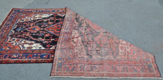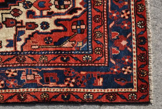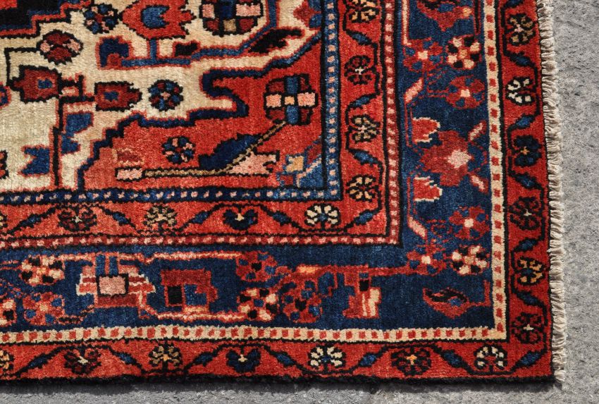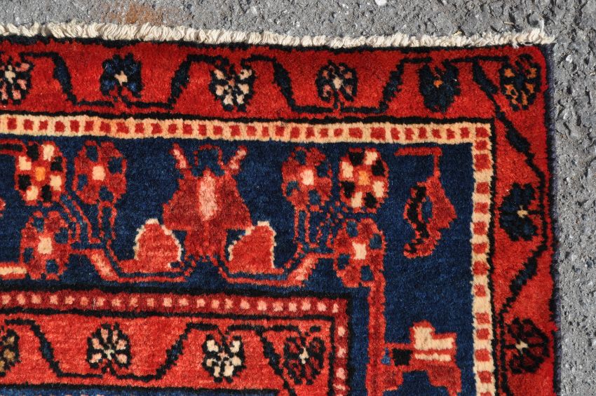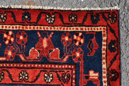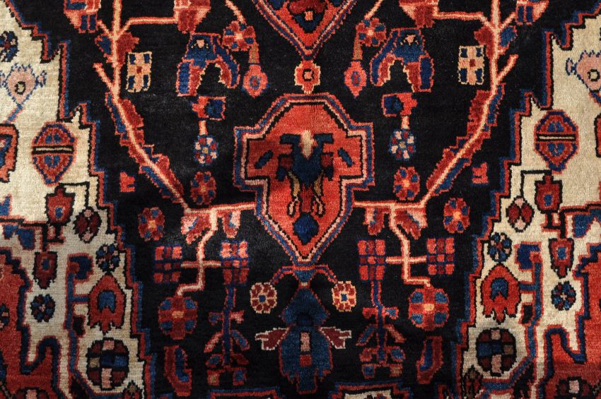 A 20th century hand woven Persian Islamic Nahawand carpet rug. The rug having a large diamond shaped medallion to the centre set on dark blue / black field decorated with floral / geometrical red and blue motifs, cream corners, red inner and outer borders decorated with floral motifs, dark blue main border decorated with red geometrical motifs. Short white fringes to rack end and dark colour pile directions to rack side. Measures: 295cm x 152cm.