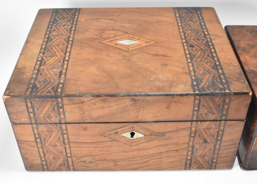 A collection of Victorian mahogany and rosewood work boxes together with a writing slope in mahogany and a Sorrento ware olive wood inlaid puzzle box marked Souvenir and a mid century white and gilt painted box with scene of Florence to the top.