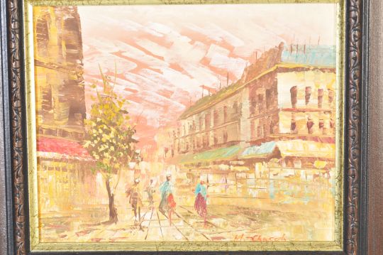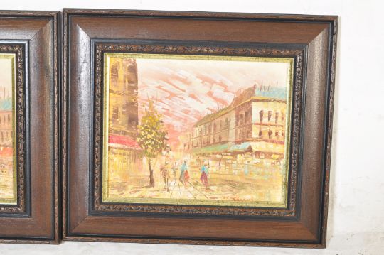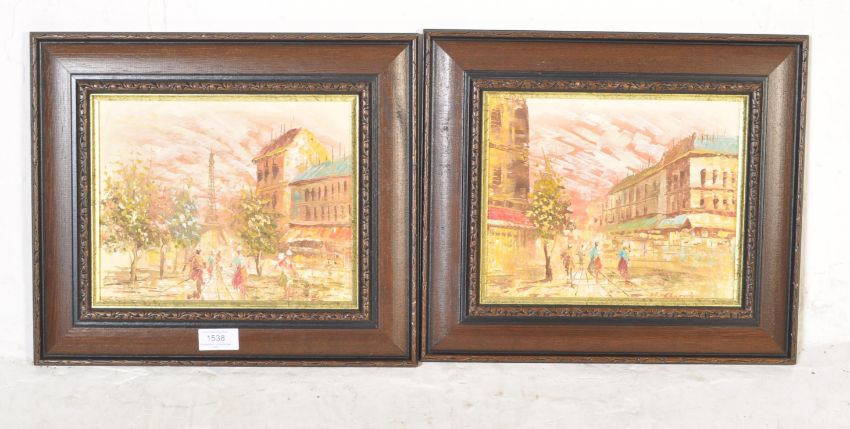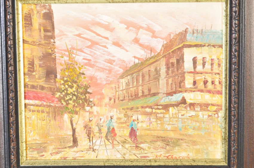French School (20th century): A pair of Parisian Street Scene with Flower Market scene to one and the Eiffel tower to the next.  oil on canvas being signed M Church to the corners. Framed.
