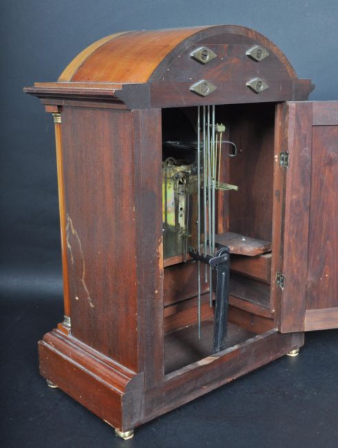 An early 20th century Edwardian inlaid 8 day mantle clock having an arch top mantel clock with engraved silvered face and Roman numerals to the chapter ring raised on a stepped plinth base. Measures 41cm x 30cm