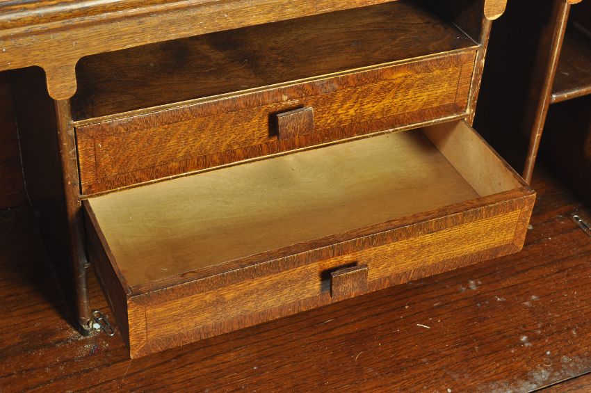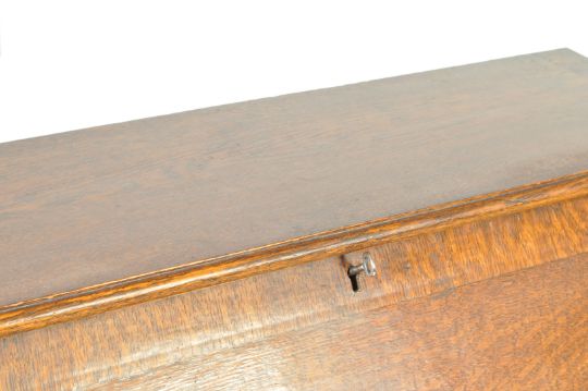An early 20th century oak bureau desk. The desk having falling front opening to reveal a fitted interior above a bank of three graduated drawers with block handles raised on cabriole legs. Measures approx. 112cm x 77cm x 41cm