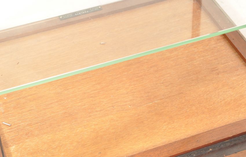 A vintage retro mid century museum / shop haberdashery pedestal display cabinet having glass panels with glass shelves. Measures: 77cm x x 46cm x 40cm