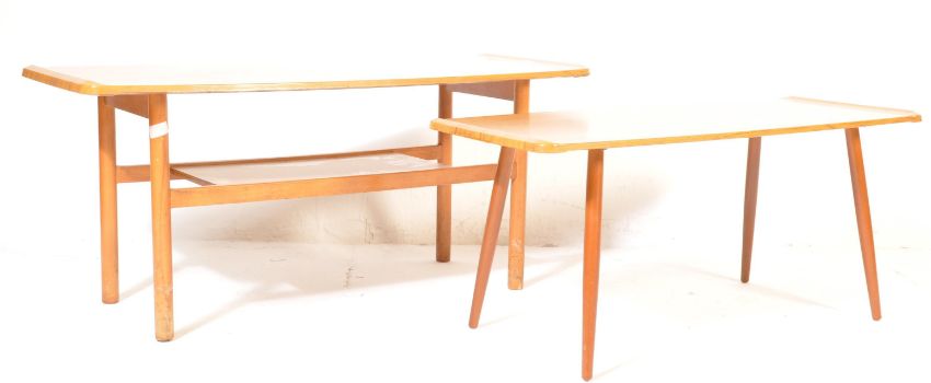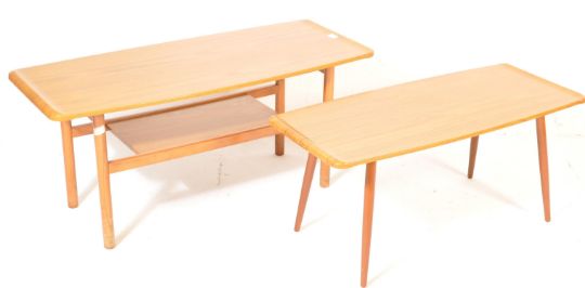 A retro vintage mid 20th century circa 1970s teak coffee table of rectangular form having upright tapering supports united by a magazine tray underneath together with another.