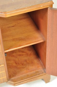 A vintage retro mid 20th century Art Deco style walnut sideboard credenza. The sideboard of a long rectangular form having a small gallery back, bank of three drawers to the centre flanked by single door cupboards raised on shaped feet. Measures approx. 79cm x 111cm x 53cm