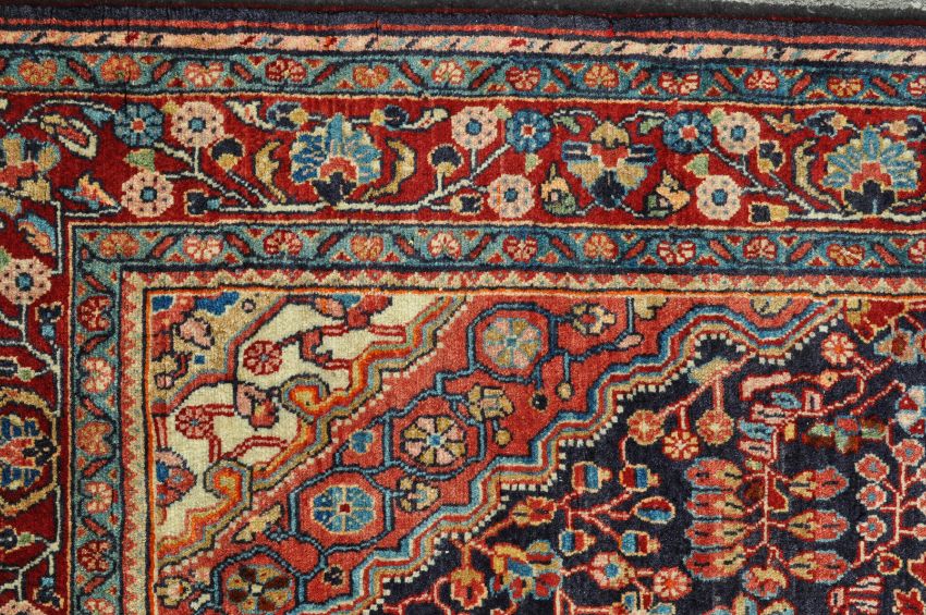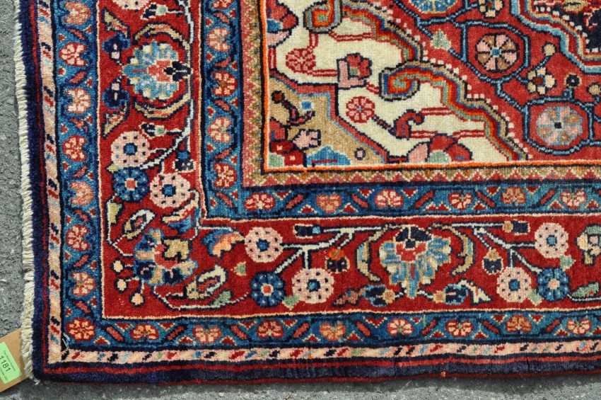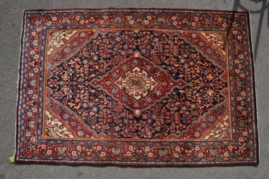 An early 20th century circa 1940’s hand woven Sarouk carpet rug. The Persian Islamic rug having a large diamond shaped medallion to the centre set on a dark blue field decorated with multiple floral motifs. White fringes to each end and red pile direction. Measures: 200cm x 131cm