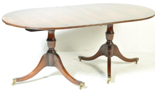 A Regency Revival mahogany twin pedestal dining table of oval form having an inlaid border with reeded edges raised on twin splayed bases. Comes with extra leaf. Measures approx. 77cm x 244cm x 104cm.