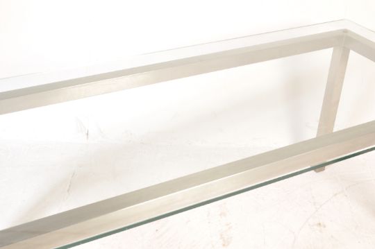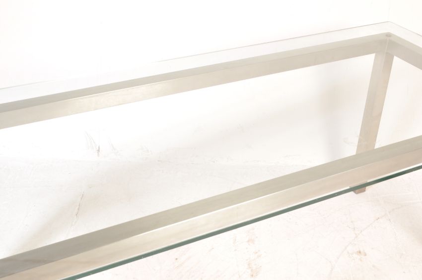 A contemporary 21st century industrial dining table having a clear glass table top of rectangular form raised on chrome tubular legs.