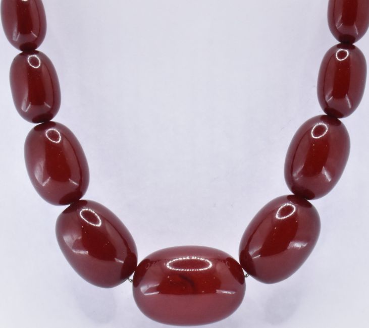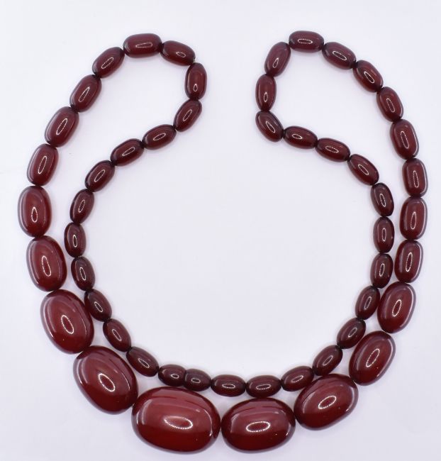 A vintage cherry bakelite necklace having graduating oval red coloured beads. Measures 70cm. Weight 56.2g.