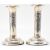 A pair of silver hallmarked candle sticks of small proportions each having round bases with cylindrical columns and moulded floral garland detailing with fared scones to the top. Hallmarked Birmingham 1906, makers marks for Henry Matthews. Measures 13cm tall. Filled, weight 312g.
