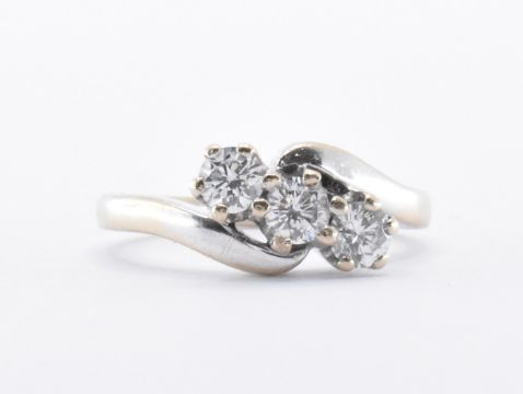 A hallmarked 18ct gold and diamond three stone crossover ring. The ring being set with three round brilliant cut diamonds. Diamonds measure 3.5 x 2.2mm total estimated diamond weight 0.50 ct. Weight 4.2g. Size I. Assay marked London with common control mark, sponsors mark RG.