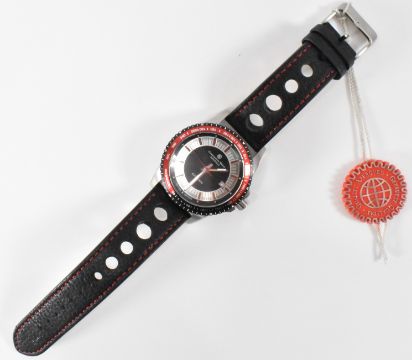 An NOS New Old Stock Constantine Weisz Bonneville automatic divers watch. The wristwatch having a silvered dial with red numerals, date box to three and tachymeter to the outer dial. Water resistant 5ATM. On a pierced leather strap. In original red helmet stylized case and still having plastic film to the back of the case. Measures 23cm in length. Face measures 42mm in diameter.