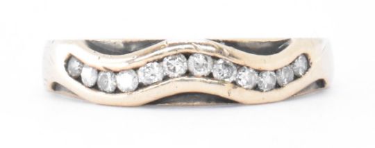 A hallmarked 9ct gold and diamond ring. The ring being channel set with twelve round cut diamonds in a wave formation to the head. Marked 9k, 375 and with a common control mark. Diamonds estimated 0.25ct. Weight 3.42g. Size K.5.