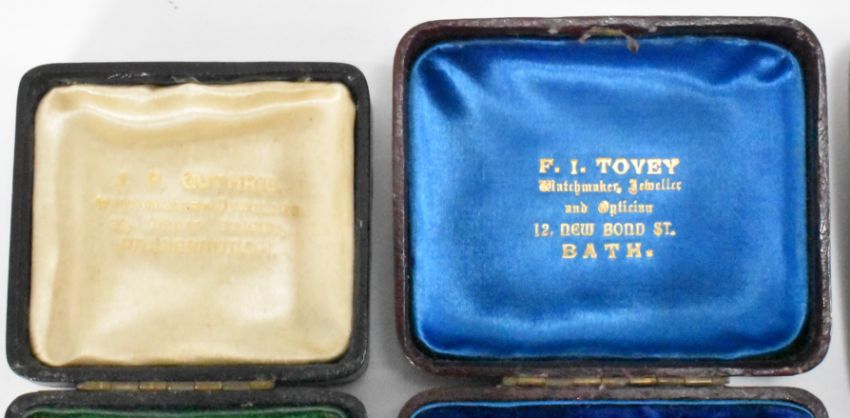 A collection of jewellery boxes dating from the late 19th Century and later. Most being tooled leather with gilt detailing. Jewellers to include Mappin & Webb, H G Weeks, R Salisbury & Son, JJ Peters & Co Bristol, W L Parkhouse Southampton, Prestons Bolton, F R Cooper & Son Colchester etc.