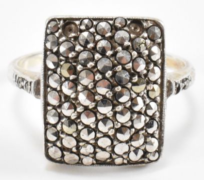 A collection of marcasite set jewellery to include a silver hallmarked enamelled orchid brooch with makers marks for CE Ld, a silver collar necklace with heart shaped links and matching earrings a silver Asmigo cocktail watch having a floral strap set throughout with marcasite's, a silver and marcasite panel ring and a white metal flower brooch. Orchid brooch import marked for London 1956. Necklace measures 16 inches, marked 925. Ring size Q, marked silver. Watch marked 925 silver, measures 7 inches. Brooch measures 7cm. Silver weight 151g.