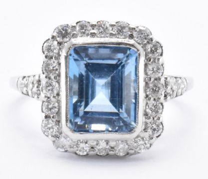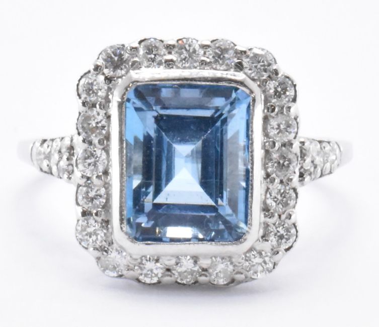 Ann 18ct white gold aquamarine and diamond cocktail ring. The ring being set with an emerald cut blue aquamarine with a halo of round cut diamonds and further diamonds to the shoulders. Aquamarine measures 9 x 7.2 x 6.2mm. Diamonds measure 2.1mm diameter. Weight 4.1g. Size Q. Band unmarked, tests indicate 18ct gold.