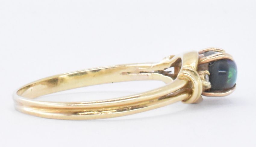 A 14ct gold and black opal and diamond ring. The ring being set with on oval cabochon flanked by two round cut diamonds. Band marked 585. Weight 1.8g. Size P. Opal measures 7.1 x 4.3 x 3.5mm.