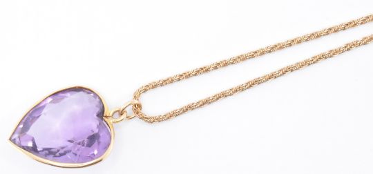 A 18ct gold and amethyst pendant necklace. The necklace strung with a collet set heart cut amethyst on an Italian chain. Chain having Italian mark Star 1 AR 750 for 18ct gold, mount tests indicate 18ct gold. Total weight weight 12.5g. Chain measures 18 inches. Pendant 1 inch. Cased.