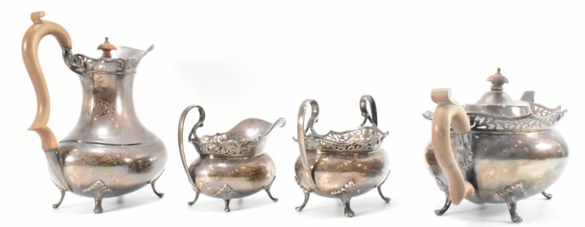 A 1920s I S Greenberg & Co silver hallmarked tea set. The service comprising of tea pot, hot water pot, sugar pot and creamer jug. All having moulded and pierced rims raised on paw feet. Hallmarked Birmingham 1921. Hot water jug measures 21cm tall, sugar bowl and creamer jug measures 11.5cm tall, tea pot measures 15cm tall. Weight 1754g.