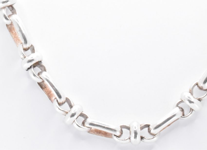 A silver fancy link necklace chain with a lobster clasp. Hallmarked Sheffield 1977, sponsors mark SS. Weight 64.9g. Measures 18 inches.