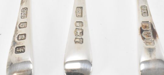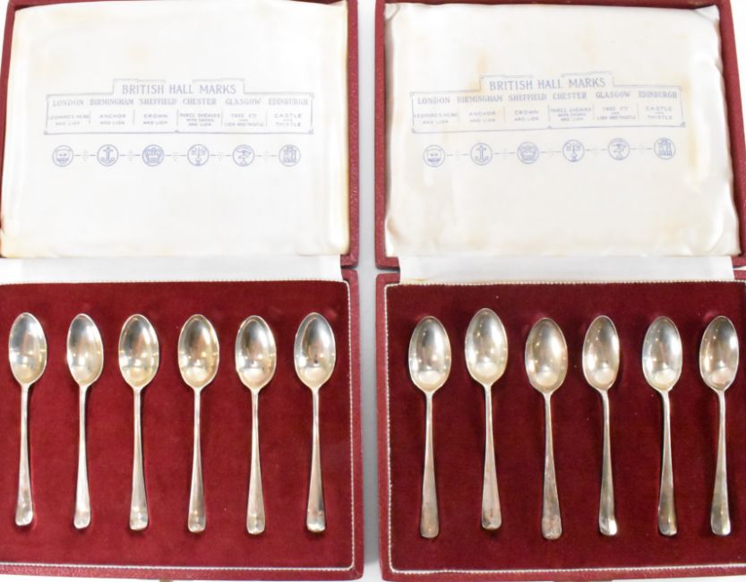 Two sets of 20th century Roberts and Belk British Hallmark hallmarked silver City set teaspoons to include two sets featuring spoons hallmarked for London, Birmingham, Sheffield, Chester, Glasgow and Edinburgh for a variety of dates. Both in original presentation cases. Total weight 153g.