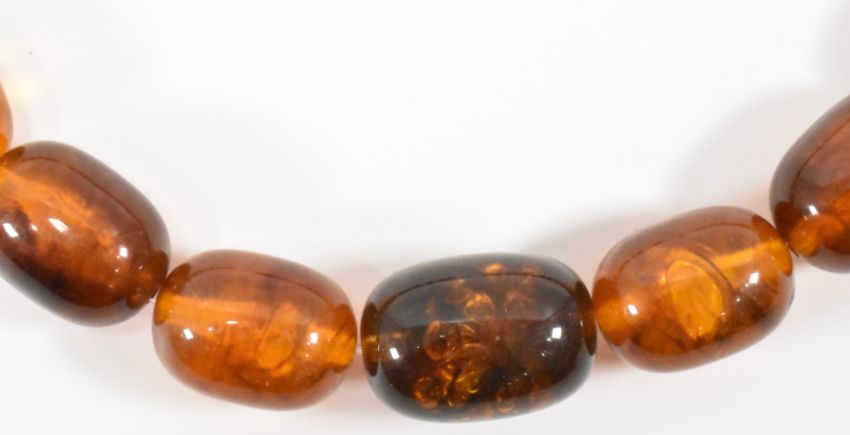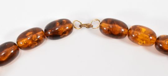 A cherry bakelite coloured plastic beaded necklace together with a simulated amber beaded necklace. Red beads measure 52cm, wides bead approx 4cm wide. Simulated amber necklace measures 60cm.