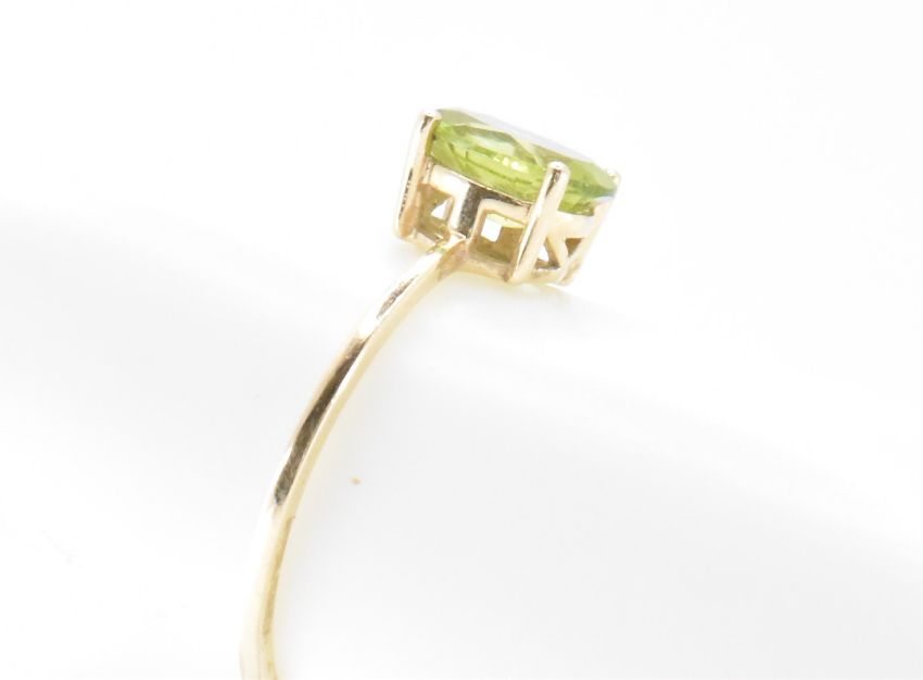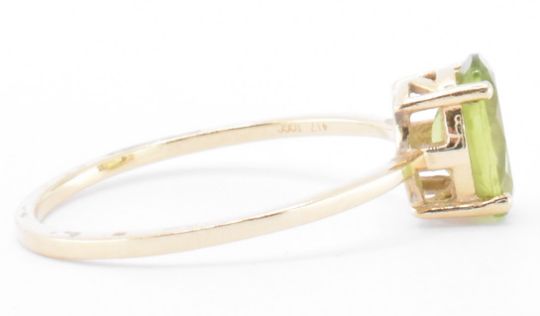 A hallmarked 9ct gold and peridot ring. The ring being prong set with an oval cut peridot on a plain band. Assay marked Birmingham CR. Weight 1.89g. Size U.