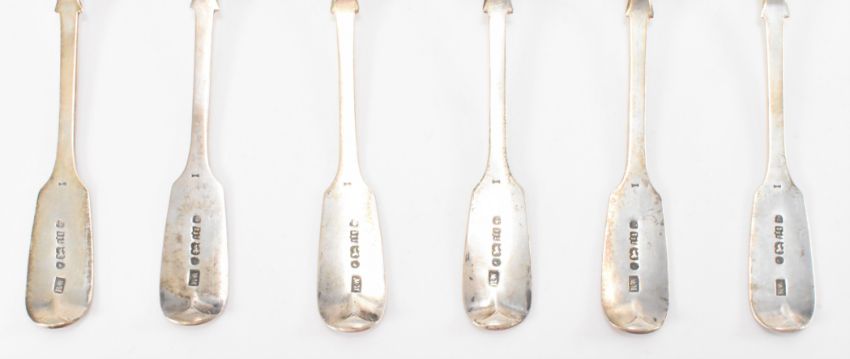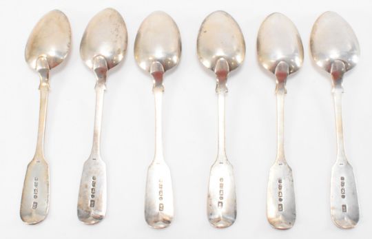 A set of six 19th Century Victorian silver hallmarked teaspoons in the fiddle pattern. Hallmarked Exeter 1844, makers marks for Robert Williams. Weight 89.6g. Measures 13.5cm.