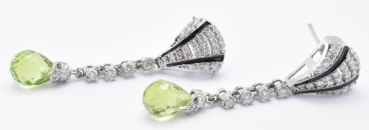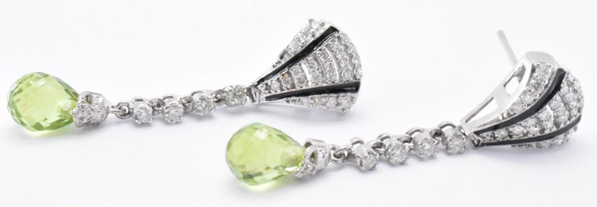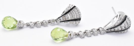 A pair of Art Deco style 18ct white gold, diamond and peridot drop earrings. The earrings having fan shaped studs to the top set throughout with round cut diamonds, with a further four round cut diamonds to the chains, terminating with faceted peridot drops. Earrings measure 4.5cm. Unmarked, tests indicate 18ct gold. Weight 8.6g.