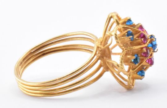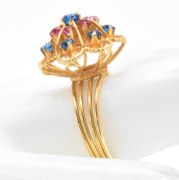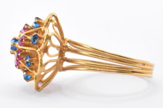 An 18ct gold and gemstone cluster harem ring. The ring set with synthetic ruby and blue stones to cluster setting with filigree decoration and wirework shank. Egyptian assay marks to outside of shank for 18ct gold, tests indicate 18ct gold. Weight 5.5g. Size R