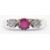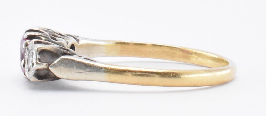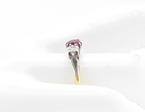 An 18ct gold diamond and synthetic ruby three stone ring. The ring being set with a central round cut synthetic ruby flanked by two illusion set round cut diamonds. Marked 18ct, tests indicate 18ct gold. Weight 2.58g. Size O. Total diamonds estimated 0.10ct.