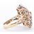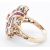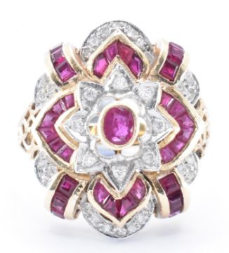 A 14ct gold ruby and diamond dress ring. The ring having a central oval cut ruby with further rectangular cut rubies and round cut diamonds in a floral mount. Marked 14k to the band, tests indicate 14ct gold. Weight 7.4g. Size O.