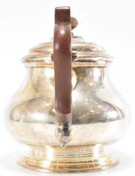 A hallmarked silver Adie Brothers George V 1920s teapot. The teapot having a carved wood knop with silver finial atop on a hinged lid and shaped wooden handle. Adie Brothers makers marks. Assay marked for Birmingham. Date letter D for 1928. Measures 16cm tall. Total weight 422g.