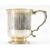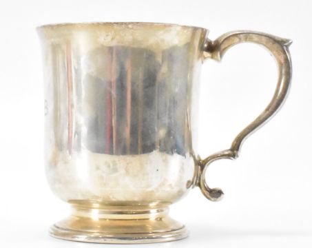 A silver hallmarked christening cup having a flared rim and scrolled handle raised on a footed base. Hallmarked London 1935, makers marks for Charles Edwards. Measures 8.9cm tall. Weight 161.2g.